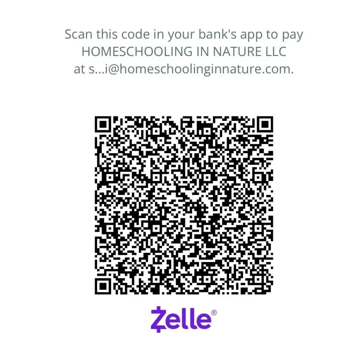 To register, simply scan this code using you Banking App to pay using Zelle. You can also find us on Zelle using the email: steffani@homeschoolinginnature.com